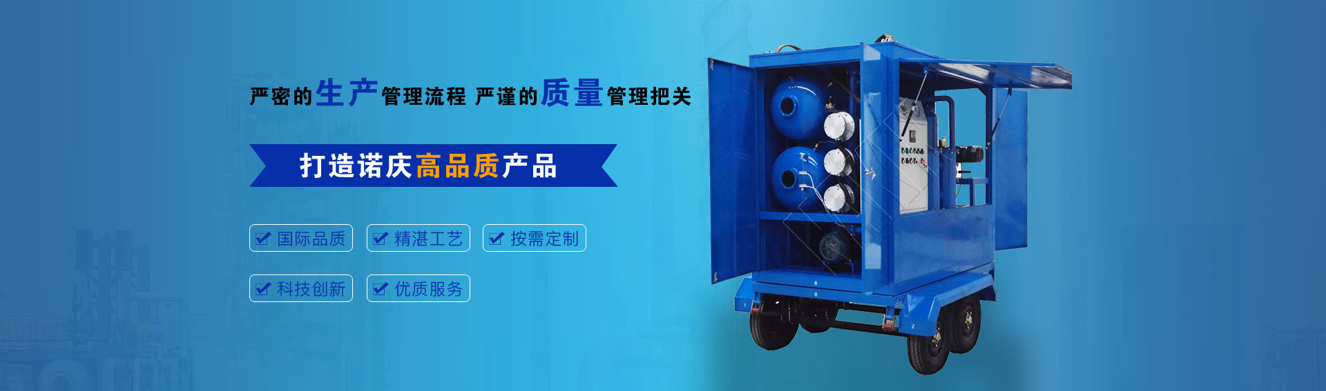公司通過ISO9001-2015質(zhì)量管理體系認(rèn)證,CE歐盟認(rèn)證,諾慶公司所有濾油機配套產(chǎn)品均采用國內(nèi)外知名品牌,經(jīng)過多年的使用,具有質(zhì)量可靠,性能優(yōu)良。公司擁有完備的檢測儀器和檢測設(shè)備,所有產(chǎn)品出廠前經(jīng)過嚴(yán)格測試,保證每一臺產(chǎn)品合格出廠。生產(chǎn)實力雄厚